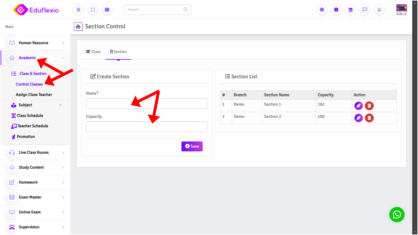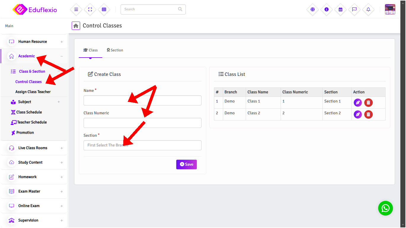 For adding Classes go to Academic > Class & Section > Class click tab 'Classes' and fill up form and click save button as shown below.You can set up multiple Section. (Example : For Class 1 can choose for Section A, Section B & Section C)